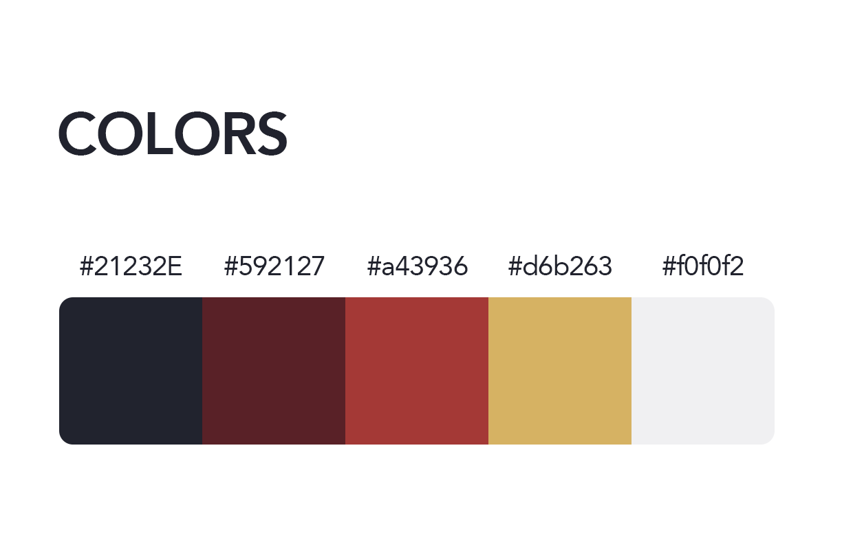 A color palette displaying five colors: dark gray, dark red, reddish-orange, mustard yellow, and light gray, with their hex codes above each color.