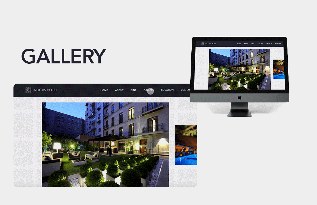 A screenshot of a hotel website homepage titled "NOCTIS HOTEL," showing an outdoor courtyard with seating, greenery, and lighting, along with a computer monitor displaying the same webpage.