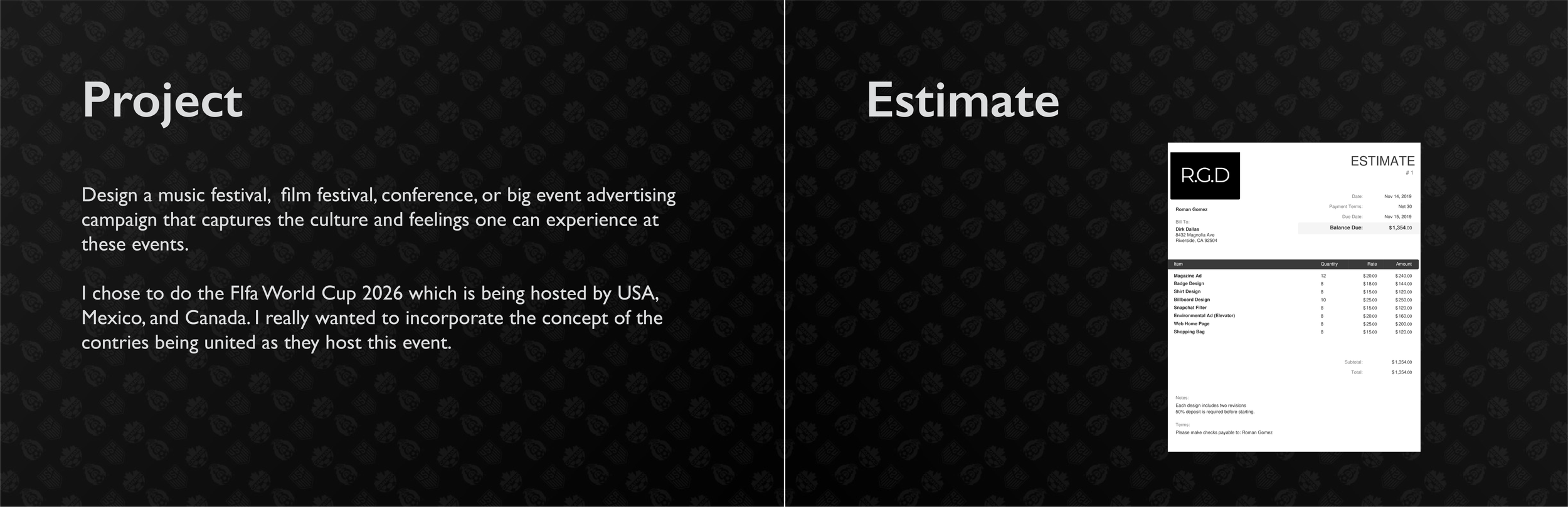 A two-page presentation slide with the left side titled 'Project' and the right side titled 'Estimate.' The left side describes designing a music festival, film festival, conference, or advertising campaign that captures culture and feelings, with a focus on the FIFA World Cup 2026 hosted by USA, Mexico, and Canada. The right side shows an example invoice with a black and white header, listed items, quantities, prices, and a total amount of $1,354.00.